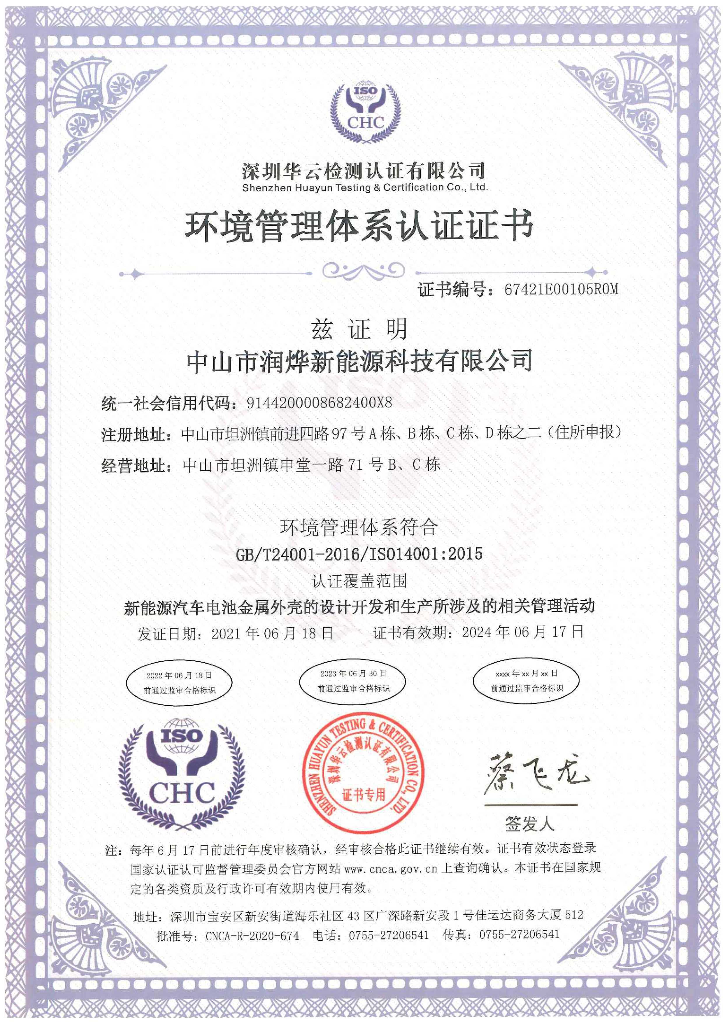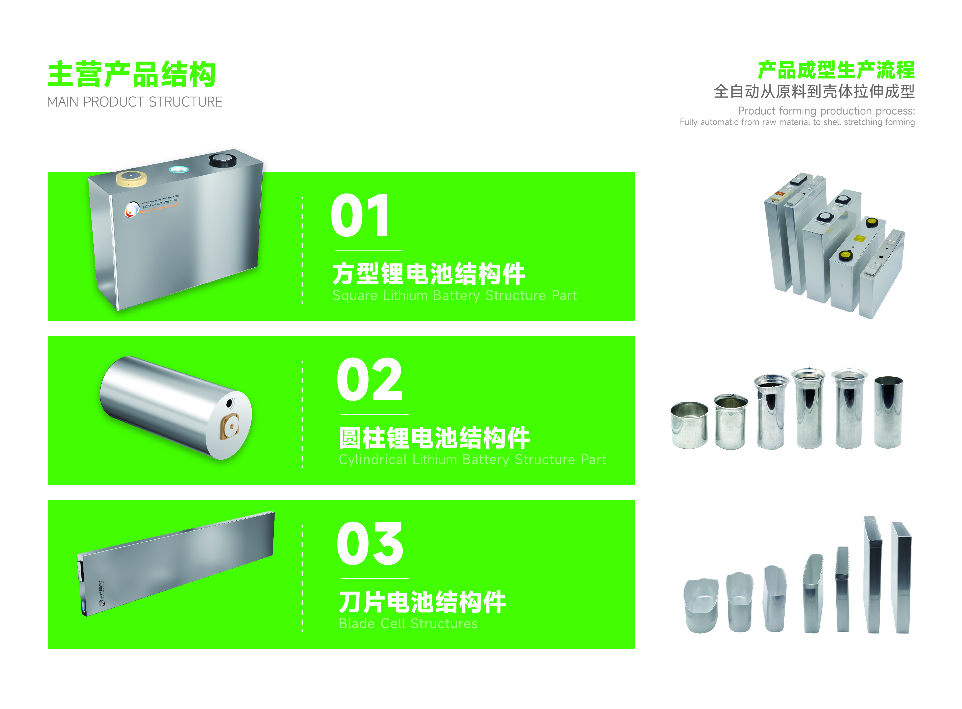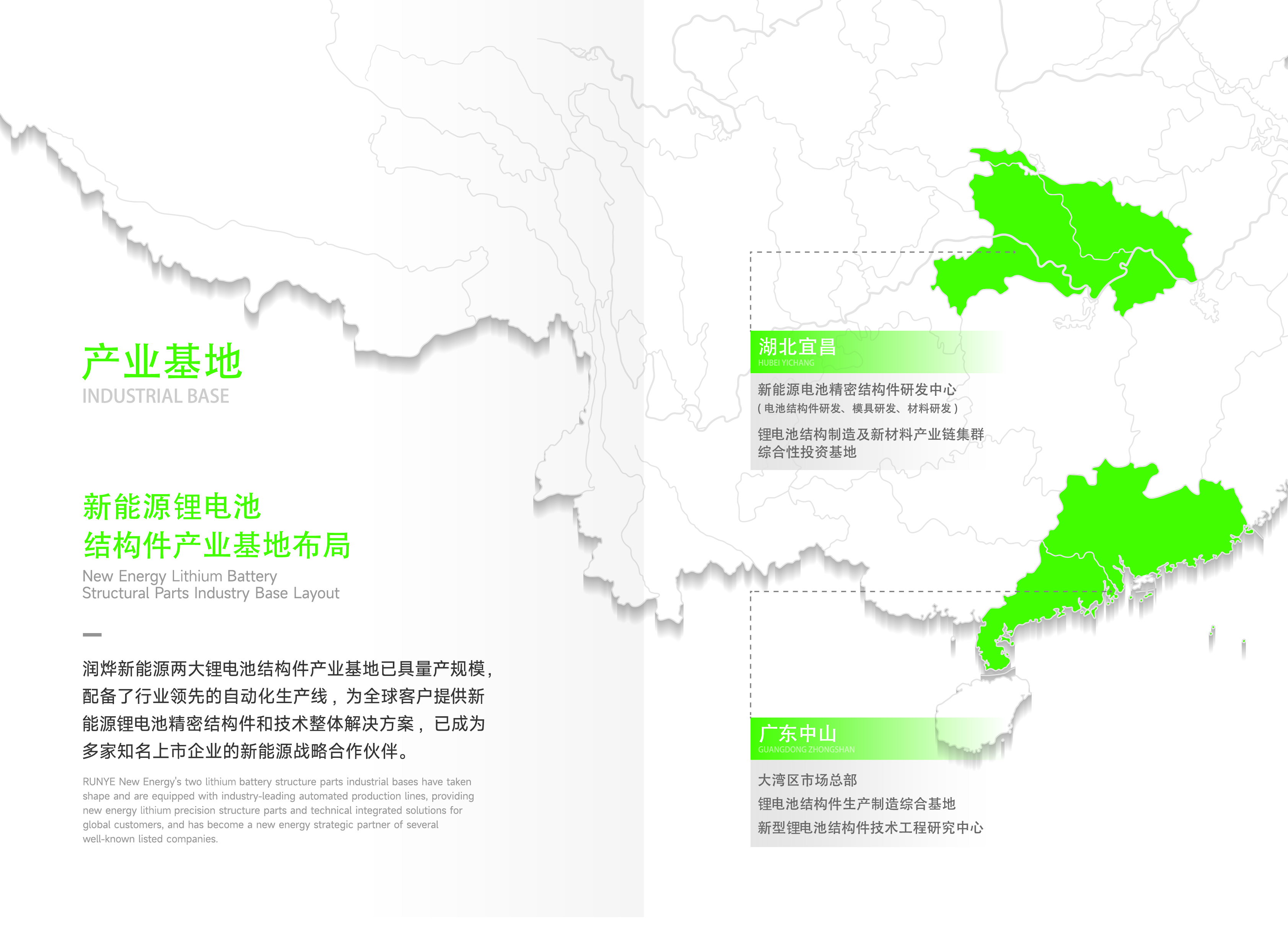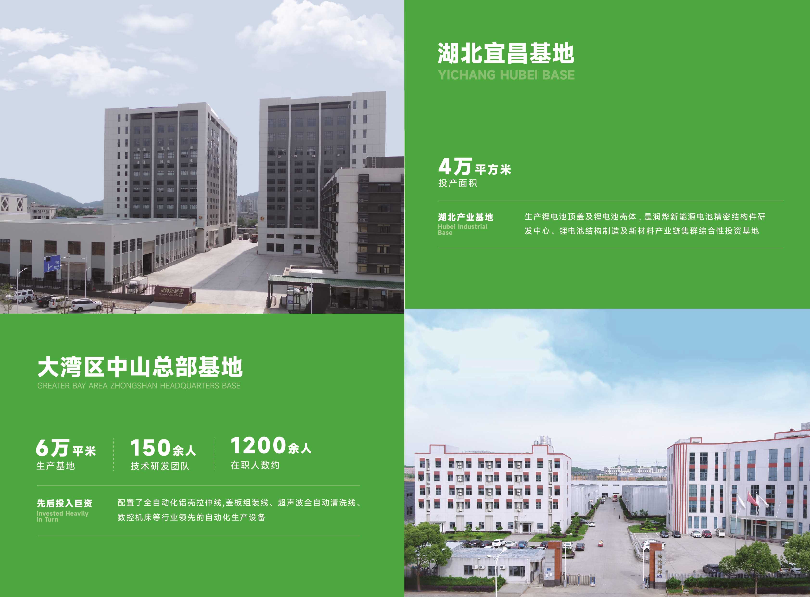 中山市润烨新能源科技有限公司是一家专注于提供新能源动力电池结构件和新能源电池PACK的研发、制造和销售为一体的高新技术企业。主营业务范围包括:新能源动力电池结构件,新能源PACK结构件,两三轮电动车电池组,四轮低速车电池包,储能电池包等产品。总公司位于粤港澳大湾区战略要地—广东省中山市,分 公司位于华中枢纽之地--湖北省宜昌市。作为新能源动力电池结构件的专业配套家,以及多年在行业内赢得 的良好口碑,同时依托华南和华中的地缘优势,我们的新能源工厂已经与国内多家知名电池公司达成战略合 作伙伴关系,作为他们的配套供应商,我司主要依托二大基地来承接和生产这些客户的订单以及做好相关的 配套服务。公司拥有达到国际领先水平的生产设备和多条自动化生产线,可提供整套动力电池结构件、储能电池结 构件的一站式服务,其中十工位“铝壳拉伸生产线”为全自动的生产模式。为实现效率、产能提升及产品品 质的进一步飞跃,科研团队自主研发出多型号高新设备,如“盖板组装线”、“自动化超声波清洗线”、 “精密CNC车床”、“精密CNC加工中心”和“精密防爆阀设备” ,“精密摩擦焊设备”,拥有业内领先的自 主知识产权发明专利和实用新型专利累计近100项,其工艺与技术位列国际领先梯队。